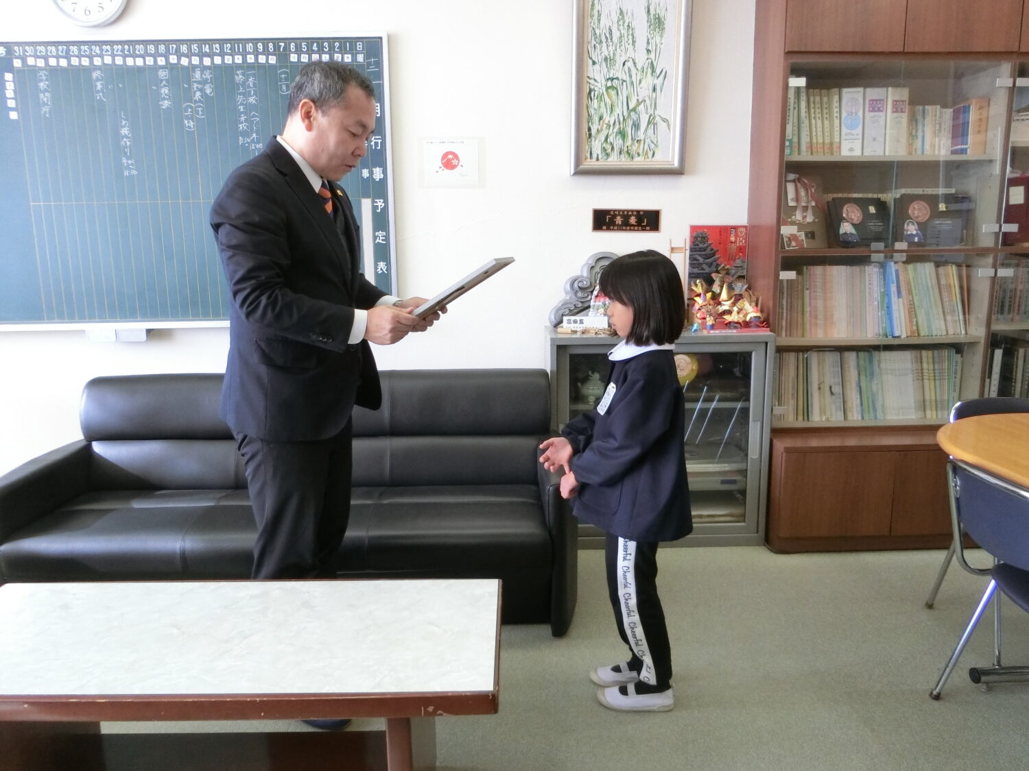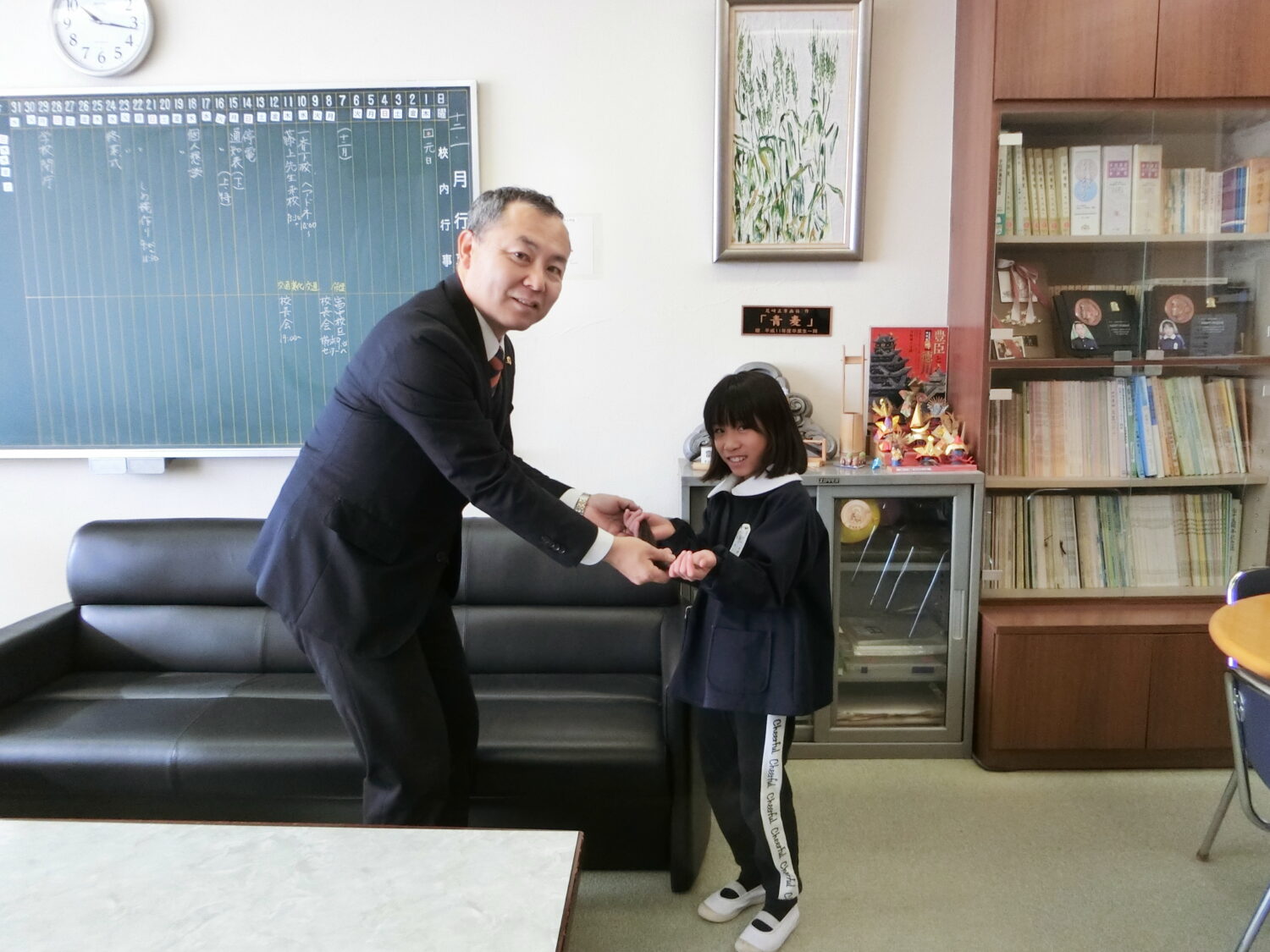 ※大内会長会長から感謝状と小児がんの子供達を支えるシンブルマーク、ゴールドリボンバッジを贈呈