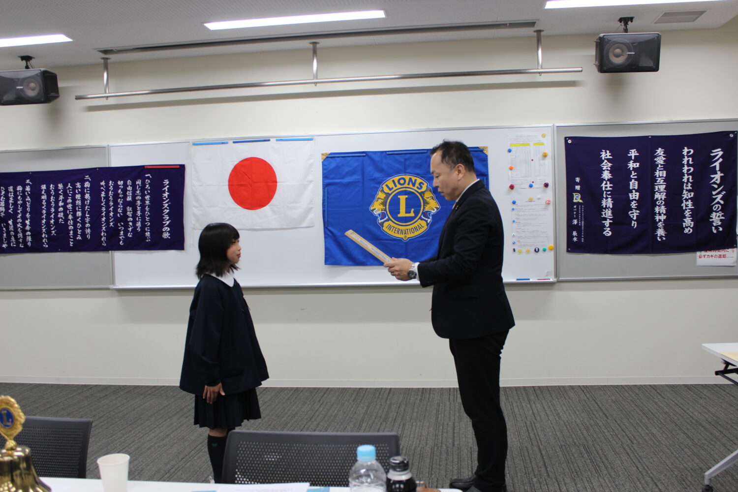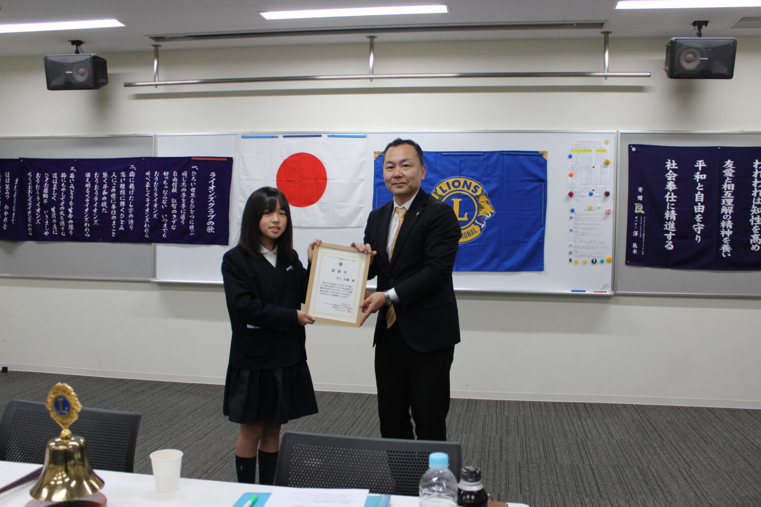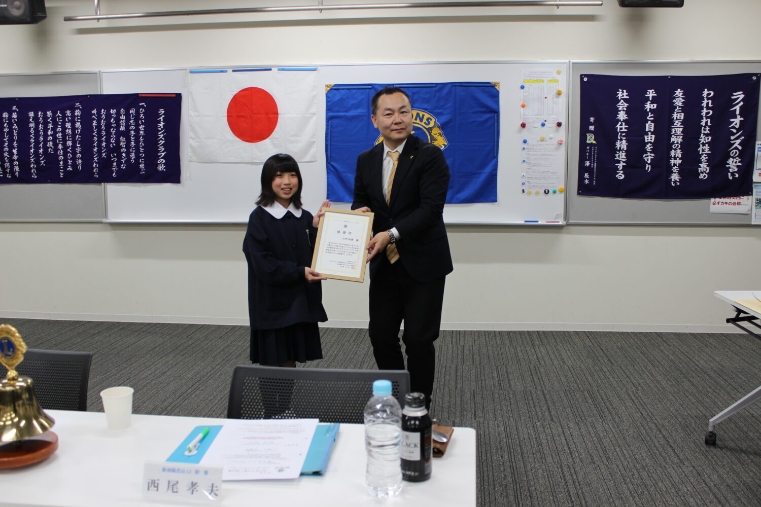 令和8年4月9日(木)新南陽若山ライオンズクラブ第一例会会場に於いて2名の小学生に感謝状を差し上げました。 ※2名の小学生のご家族 大門様と井上様